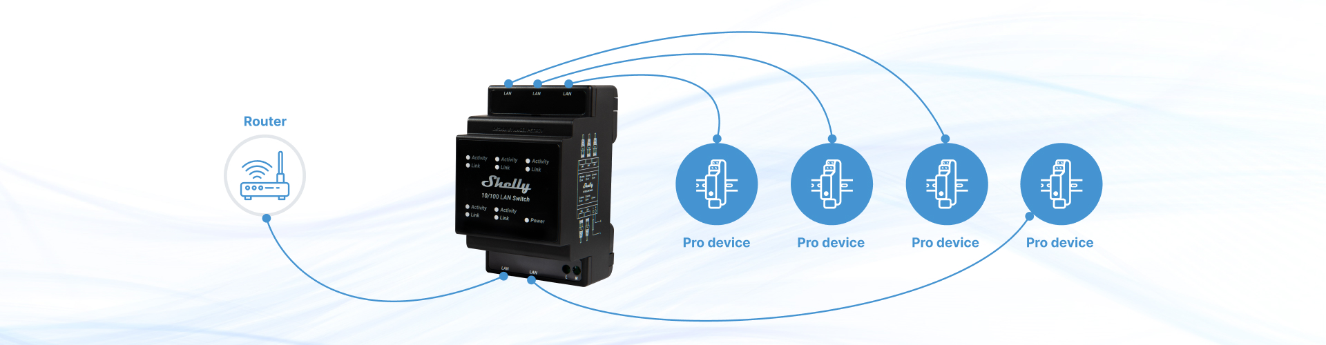 Shelly LAN Switch provides a straightforward solution for reliable connection without the need for extensive electrical modifications. Now, you only need 1 LAN cable inside your breaker box to connect your devices! Its shared form-factor with our Pro line devices ensures it fits perfectly in a Shelly-occupied breaker box, simplifying installation and maintaining an organized setup.