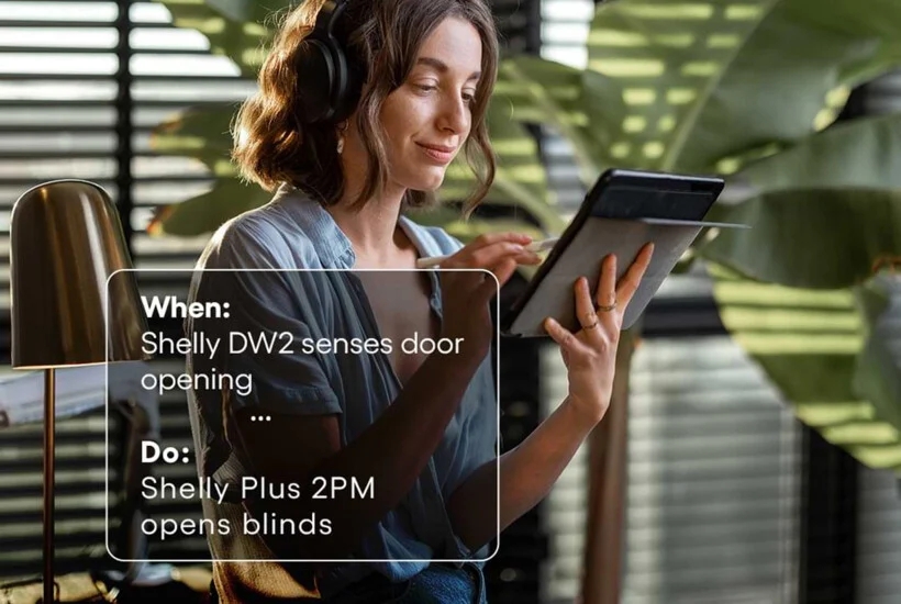 Shelly Plus 2PM, like all Shelly devices, can be grouped with other devices and be triggered to perform actions by pre-set conditions. Nowadays, many people prefer working from their home office. Install Shelly Door/Window 2 sensor on your home office door and set Shelly Plus 2PM to open the roller shutters as soon as you enter the room in the morning, letting the natural light in. Once the working day is over, Shelly Plus 2PM will shut the roller shutters and keep them that way until you are ready for the next working day.