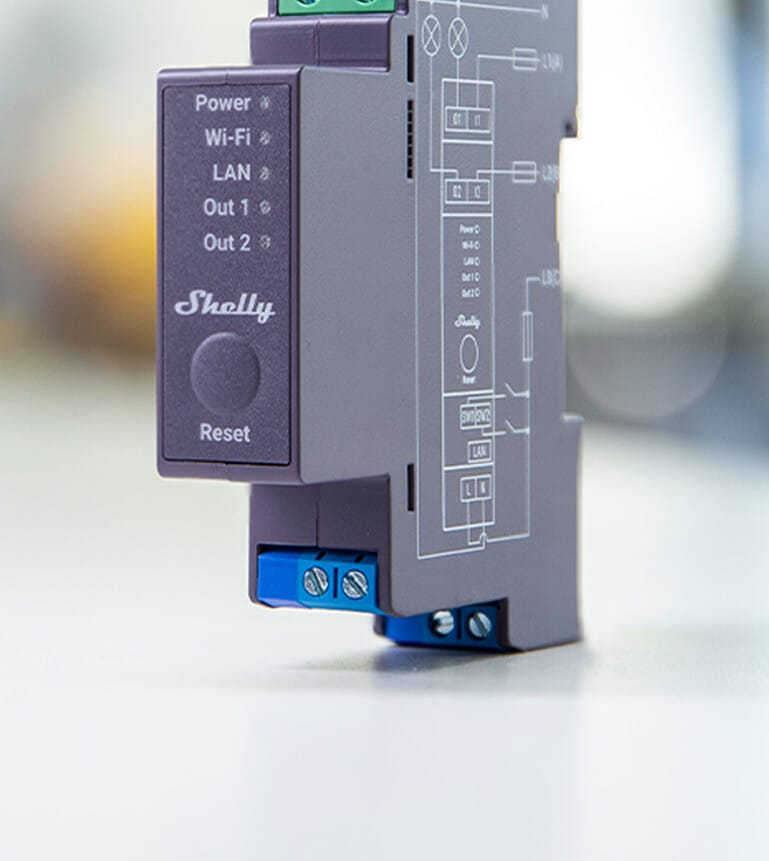 Shelly Pro 2 is a two-phase, 2-channel relay supporting up to 25 A for professional lights and appliance automation for residential or commercial use. It is equipped with potential-free outputs (dry contacts) offering high flexibility in voltage support and applications. Different types of actions, scenarios, and schedules can be set to sync your environment to your daily activities or business needs. Additionally, Shelly Pro 2 has scripting functionalities for custom automation scenes based on external data or various occurrences.